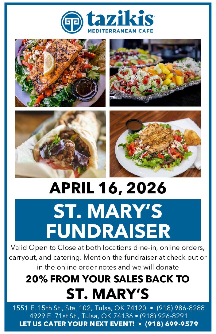 Support the Church and School of Saint Mary by visiting either Taziki’s Mediterranean Cafe locations. This offer is valid with dine-in, online orders, carryout, and catering. Mention the fundraiser at check out or in the online order notes and 20% of your sales will go back to Saint Mary!